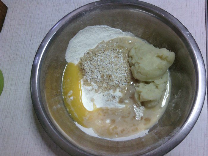 В большую миску просейте муку, добавьте соль, дрожжи, отруби, сухое молоко и остальные ингредиенты (воду, мёд, пюре, размягченное сливочное масло и яйцо) - замесить тесто. :)