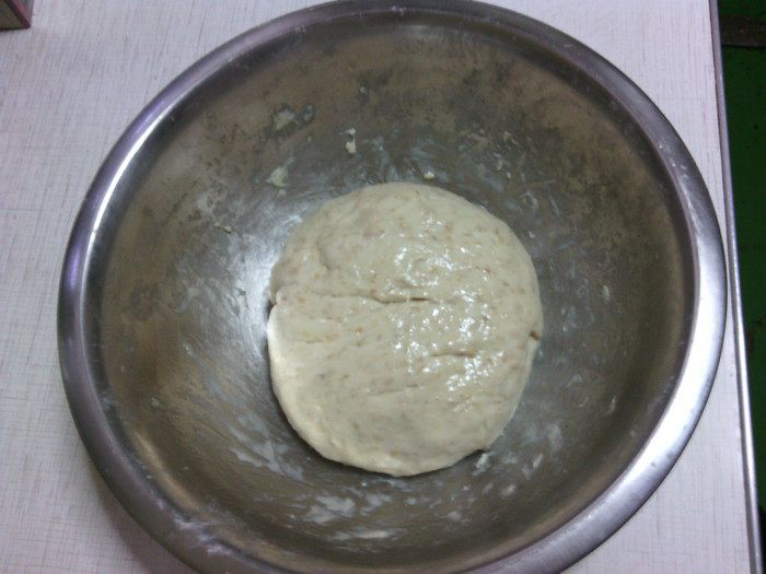 Положите тесто в миску, смазанную маслом, накройте полотенцем и оставьте на 1,5 ч. в теплое место. За это время тесто подойдет, и его объем увеличится вдвое.