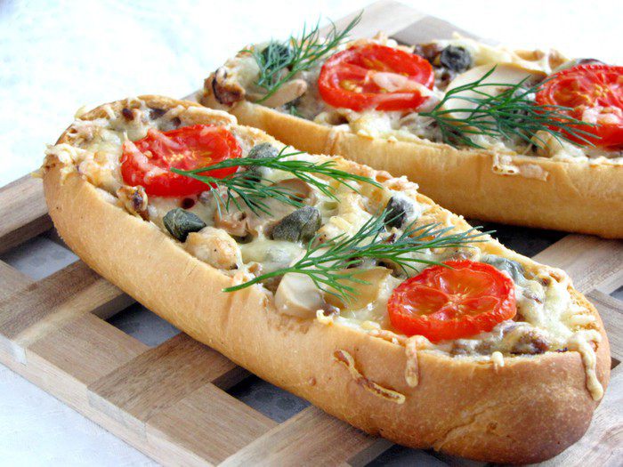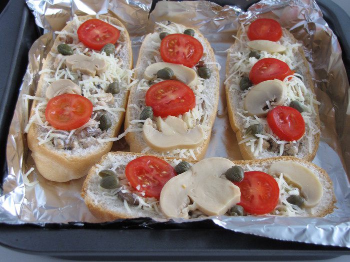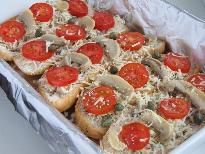 Посыпать багеты тертым сыром, украсить помидорами, грибами, каперсами. Отправить в духовку, разогретую до 200 град, на 20 минут до зарумянивания сыра.