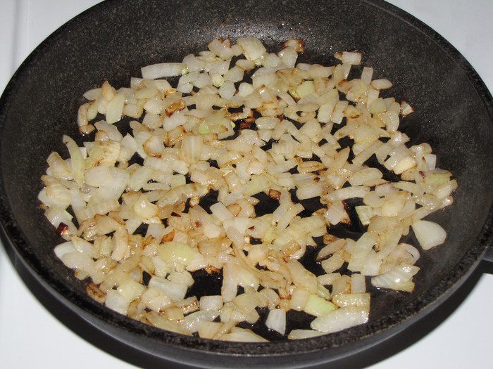 Разогреть в сковороде растительное масло и обжарить мелко нарезанный лук до румяности.