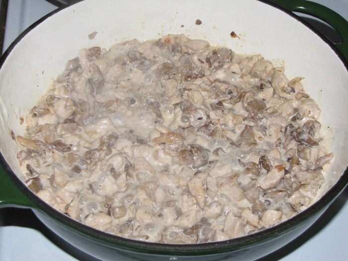 Добавить к грибам куриное филе и влить сметану, перемешать. Посолить и поперчить по вкусу. Немного потушить и снять с огня. Начинка готова.