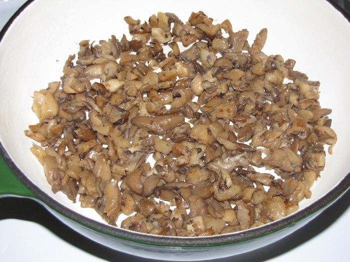 На отдельной сковороде обжарить грибы. Можно взять любые свежие грибы. В моем случае - вешенки.