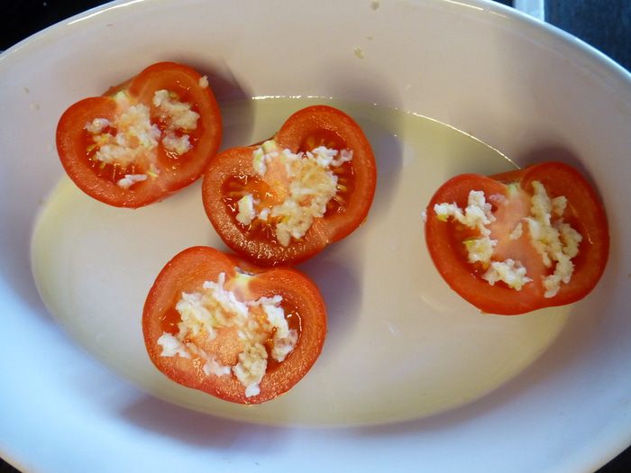 Помидоры разрезаем пополам. Форму смазываем оливковым маслом, выкладываем помидоры. На каждую половинку выдавливаем зубчик чеснока. Ставим в духовку под гриль на 10 минут.