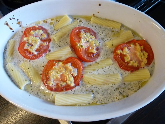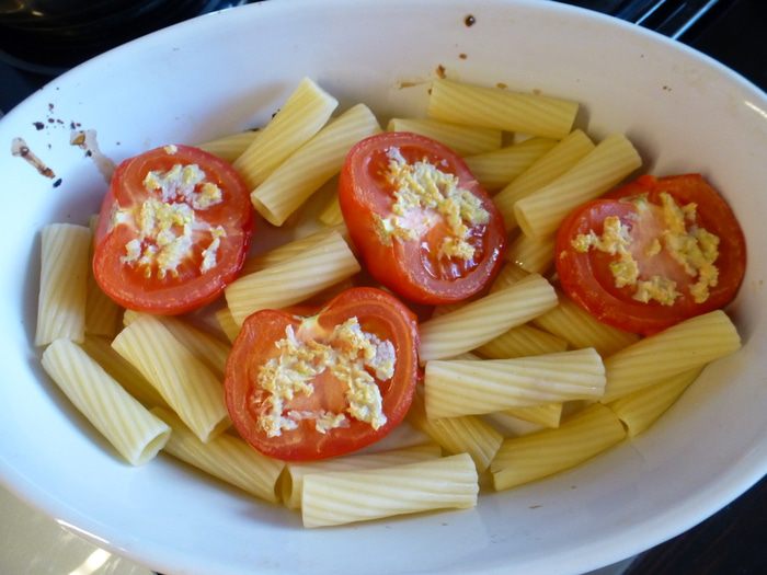 Заранее отвариваем макароны согласно инструкции на упаковке или используем остатки обеда. В ингредиентах дан вес готовых отварных макарон. К помидорам выкладываем макароны.