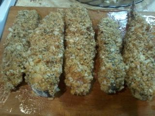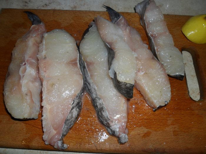 Сначала подготовим рыбу. Хорошо помоем под проточной водой, высушим бумажным полотенцем и нарежем на порционные куски. У меня в ингредиентах написано филе, но я использовала вместе с хребетиком. Посолим, поперчим и сбрызнув соком половины лимона оставим на некоторое время, чтоб рыба пропиталась специями. Можно посыпать и другими специями по вкусу.