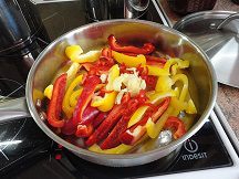 Сколько времени? Это зависит от того какая степень готовности вам необходима. Если вы хотите подавать его как гарнир – достаточно 10 минут. Если тушить подольше, пепероната будет скорее напоминать соус. Его можно даже приготовить впрок, разложив горячим, прямо со сковороды, в ошпаренные кипятком небольшие баночки, герметично закрыть и хранить в холодильнике.