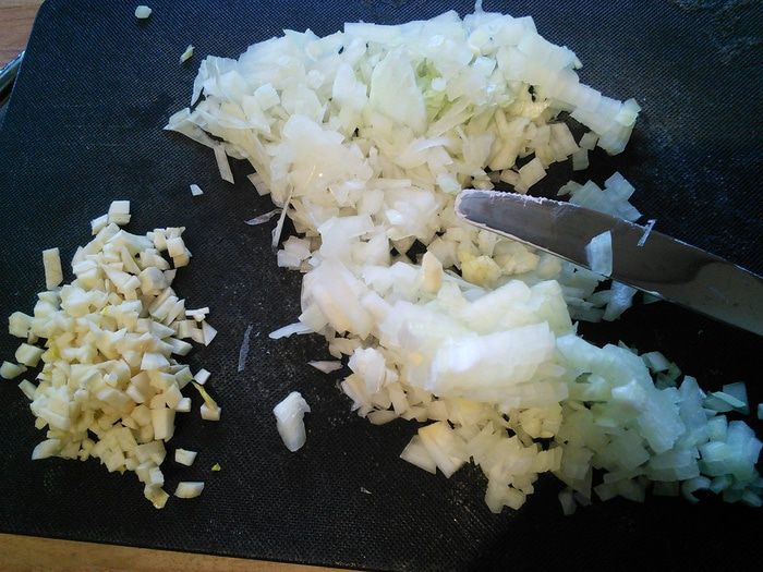 Начнем с подготовительных работ. Я уже упомянула, что суп готовится очень быстро, поэтому подготовим всё заранее. Нарежем мелко крупную луковицу и чеснок. Мне захотелось добавить ещё два стебля сельдерея.