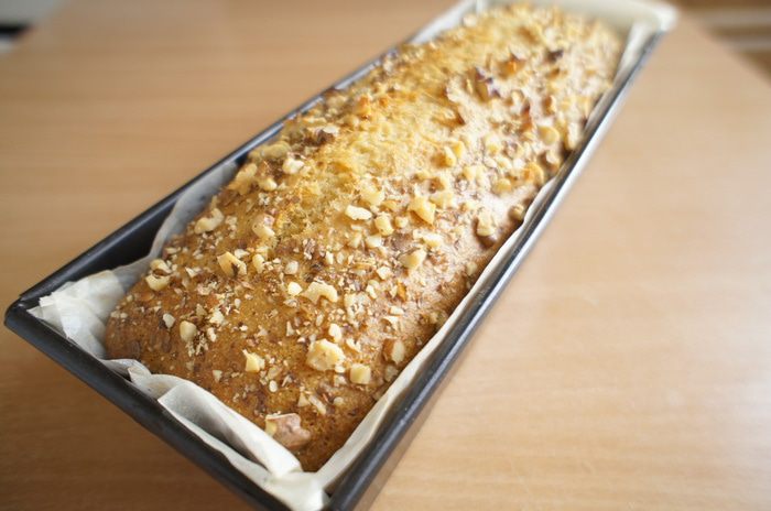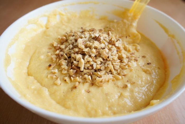 Тесто выложить в форму. Посыпать оставленными измельченными грецкими орехами и выпекать 35-40 минут (ориентируйтесь по своей духовке). Готовность проверить деревянной шпажкой.
