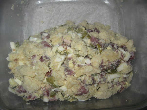 Для начинки перемешиваем яйца, мясо, огурцы, мякиш багета и сливочное масло.