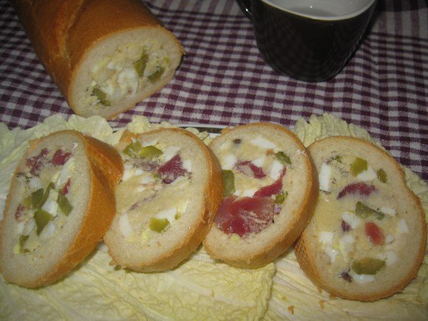 Фаршируем багет начинкой, чайной ложкой. Хорошо вталкиваем. У меня начинки не осталось.
