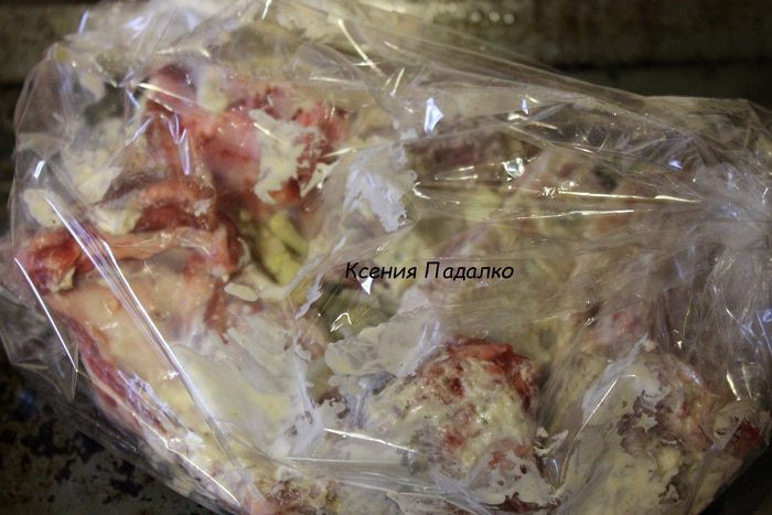 Далее кладем в рукав лук и чеснок, а сверху выкладываем ребра.