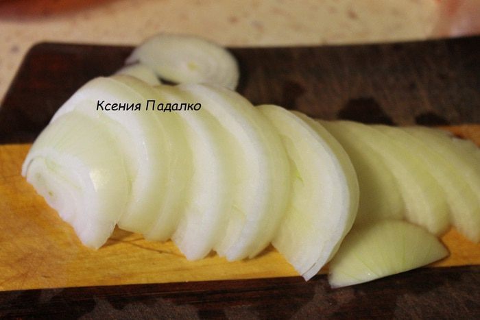Лук нарезать крупными полукольцами, чеснок очистить и разрезать пополам.