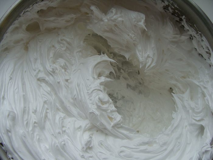 Опускаем ковш в кипящую воду (огонь средний). Взбиваем миксером белки на высокой скорости, пока масса увеличится и загустеет (минут 7). Когда белки начнут немного наматываться на миксер, и дно начнет проглядывать, вытаскиваем ковш, ставим на холодную поверхность, не прекращая взбивать. Взбиваем около 3 минут, до остывания белков до комнатной температуры. Масса густая. Кладем ее в кондитерский мешок и украшаем по желанию.