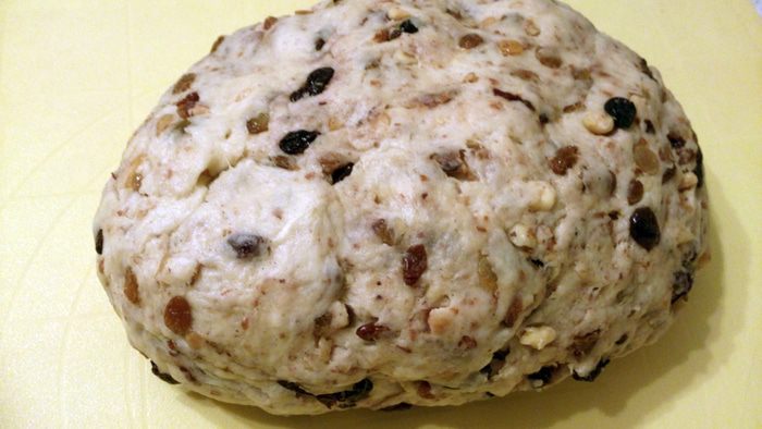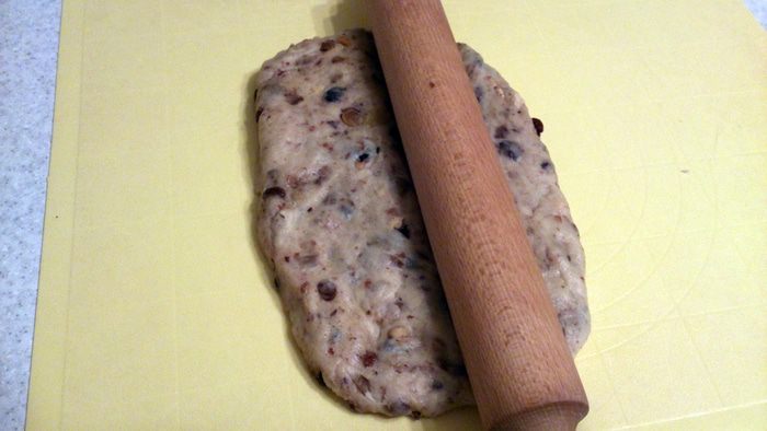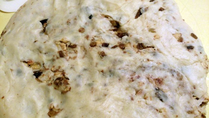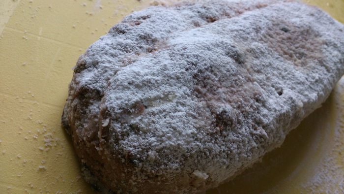 Теперь завернуть большую сторону. Таким образов сформовать все штоллены. Здесь еще один совет от автора — стряхнуть сверху весь вылезший наружу изюм и положить его в серединку. Так он не сгорит при выпечке.