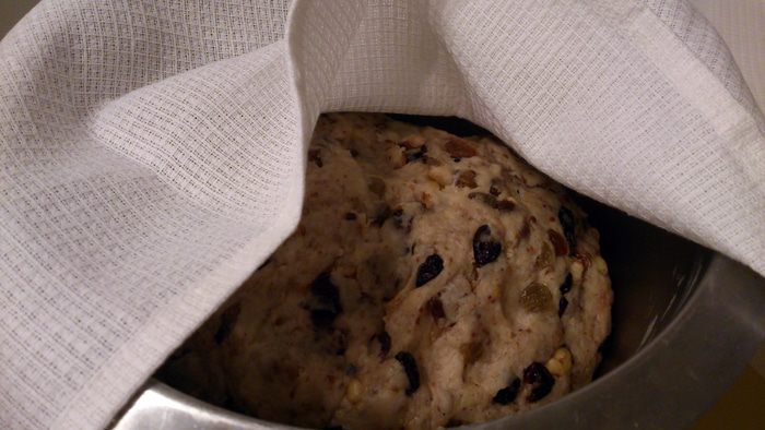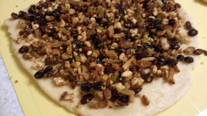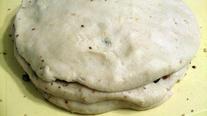А теперь отличный способ вмешивать изюм и орехи в тесто. Делим тесто на 3-4 куска. Каждый кусок разминаем в пласт и покрываем слоем добавок. Хорошо их вдавливаем руками.