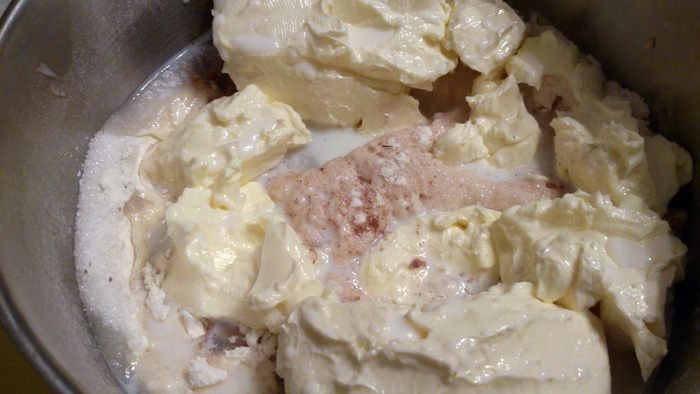 Через 20 минут дрожжи уже работают и можно добавить остальные ингредиенты. По кругу высыпать сахар, специи, выложить масло, добавить оставшееся молоко, соль.