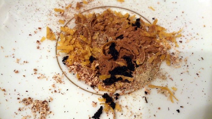 Ваниль вынуть из стручка и смешать с цедрой и специями. У меня смеси для пряников нет, поэтому добавила свои любимые — кардамон, корицу, мускатный орех.
