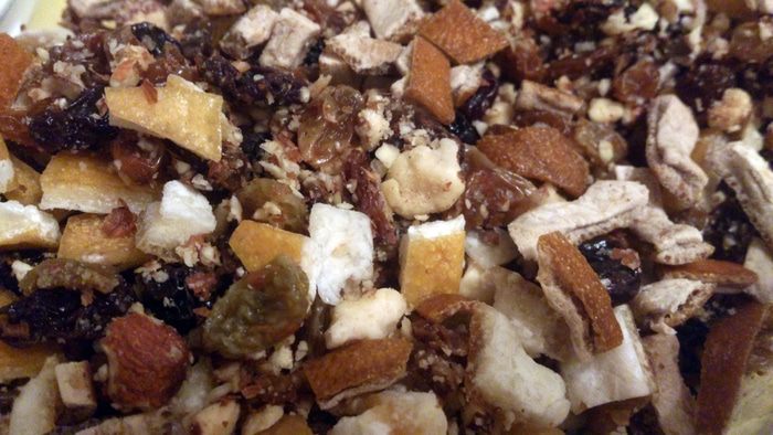 Половину миндаля измельчит в крошку. Изюм промыть и залить кипятком на 5 минут. Процедить. Смешать в миске изюм, цукаты, миндаль и залить ромом. Закрыть крышкой и оставить на ночь в комнате.