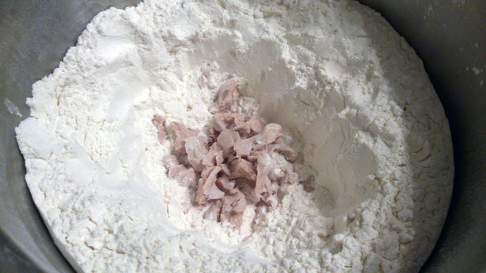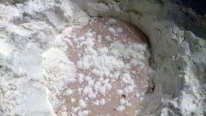Всыпать немного сахара и влить часть теплого молока. Дрожжи размять рукой, смешивая с молоком и немного с мукой. Присыпать немного смесь сверху мукой и оставить под полотенцем на 20 минут.