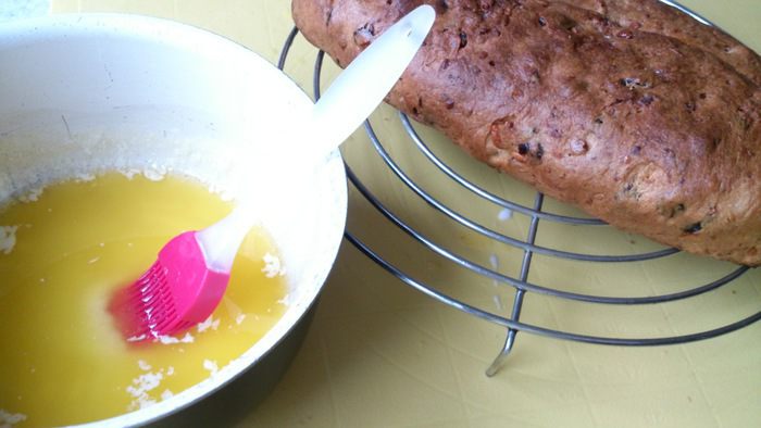 Теперь нужно сделать на штолленах глазурь. Для этого горячие штоллены наколоть деревянной шпажкой, обильно смазать со всех сторон растопленным сливочным маслом и обсыпать сахаром.