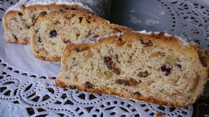 В прошлом году я пекла несколько штолленов, но впечатлил меня только шоколадный Поэтому в поисках идеального рецепта я решила пройтись по немецким кулинарный сайтам. Кто же может лучше рассказать вам о штолленах, чем сами немцы? Автору этот рецепт достался в наследство от родителей, которые держали кондитерскую в Дрездене. Рецепт сопровождался массой полезных советов. Я была уверена в результате практически с первых строк, поэтому пекла на полный состав. И еще рецепт мне понравился тем, что приготовление идет в две стадии , что совсем не хлопотно. После пробы испекла вторую партию и теперь с нетерпением жду вызревания. По ходу рецепта буду давать советы автора. P.S. В момент дегустации неожиданно явились гости (наверное на запах пришли) и я получила кучу комплиментов штоллену от одного очень привередливого дегустатора!