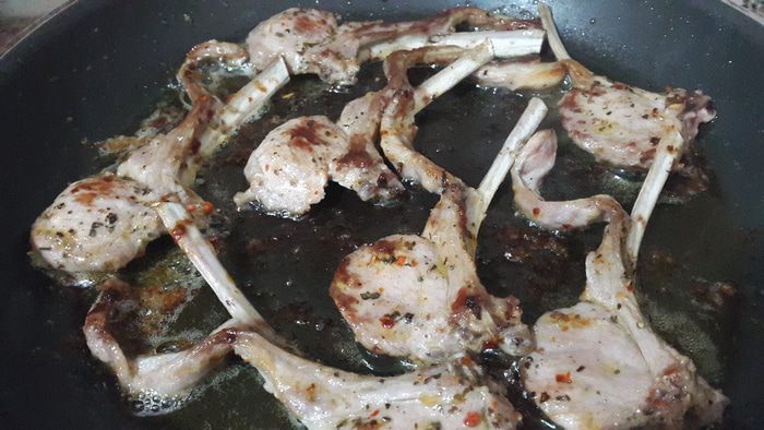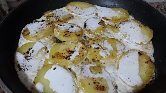 Обжариваем с двух сторон до румяной корочки на том же масле, на котором обжаривали ребрышки, солим. Добавляем сливки, и когда они выпарятся - выключаем огонь.