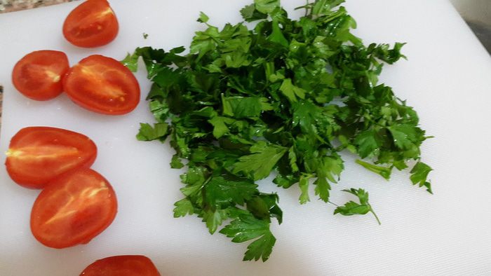 Петрушку рубим, помидоры режем пополам.