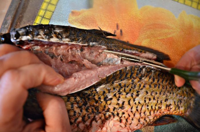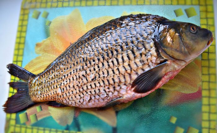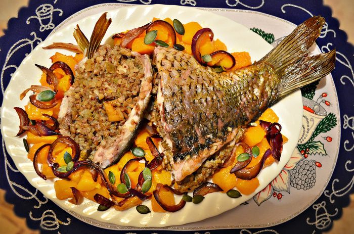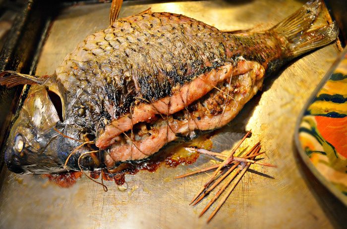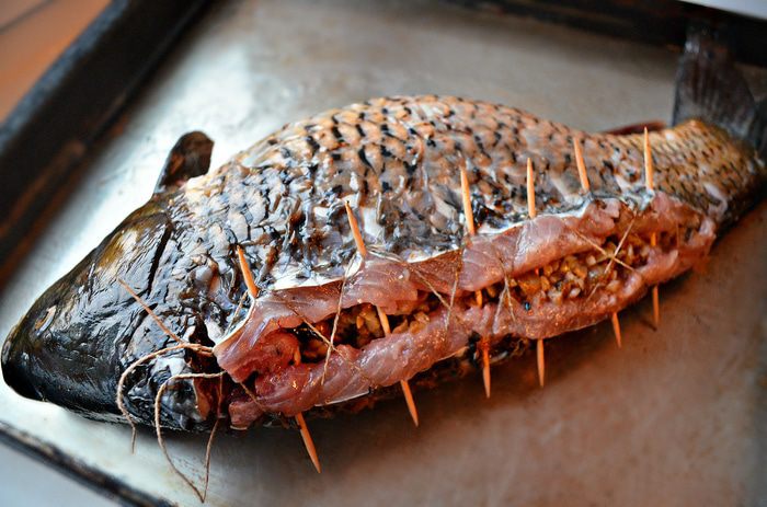 С помощью металлических, а если нет - деревянных шпажек, зубочисток соединяем рыбу. А кулинарной нитью делаем "шнуровку", слегка подтягивая нить, завязываем концы. Смазываем поверхность противня и самого карпа растительным маслом. Выкладываем карп на противень и запекаем 10 мин в нагретой до 220г духовке. Затем убавляем жар до 180г и готовим ещё 30-40 мин. Таким образом поверхность рыбы получится с красивой румяной корочкой, а внутри рыба будет сочной.