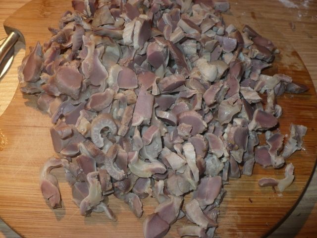 Желудки отварить часа 2, мелко порезать.