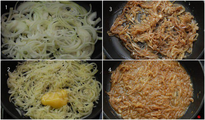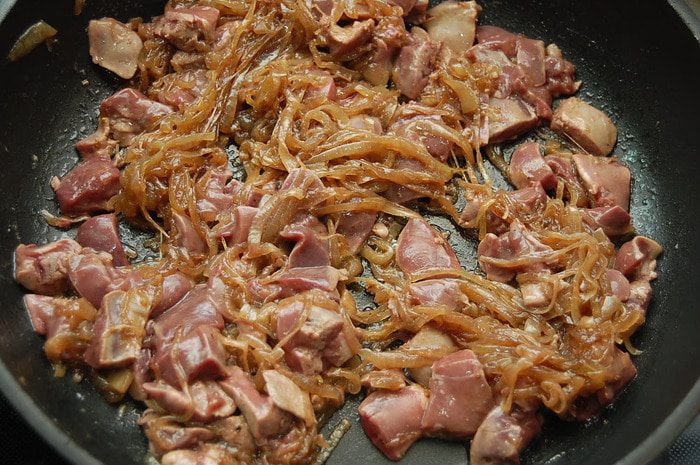 Выкладываем пасту на тарелку, сверху - печень с луком.
