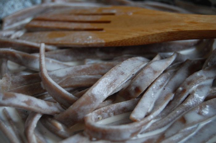 Когда сыр расплавится и содержимое сковороды начнет пузыриться - добавляем отваренную пасту. Прогреваем несколько секунд, снимаем с огня. При желании в соус можно добавить бульон, в котором варилась паста.