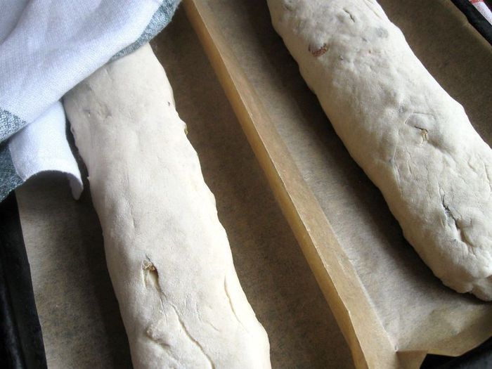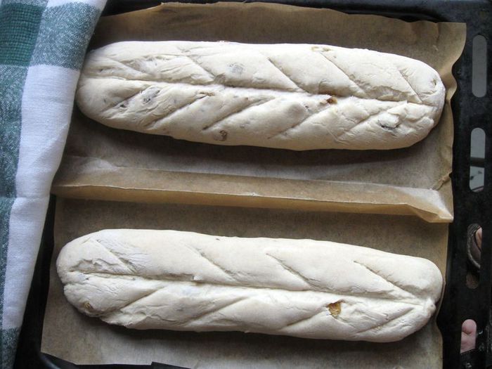 Духовку разогреть до 230 градусов, вниз поставить емкость с кипятком. На багетах сделать разрезы острым ножом (скальпелем, бритвой). Один, более глубокий – вдоль багетов, другие – по типу листа растения - косые, более мелкие. Разрезы, конечно, могут быть и другие.