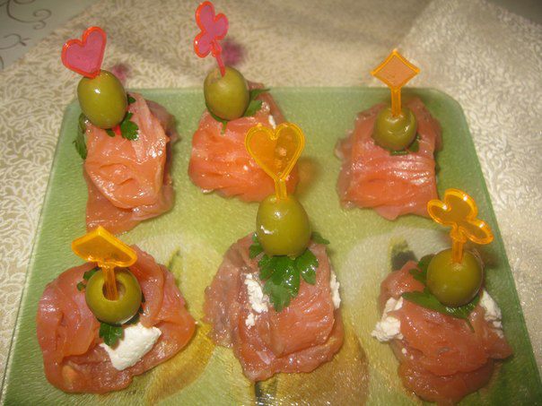 На каждый ломтик рыбы кладем по 1 столовой ложке творожной массы и сворачиваем в рулетик. На шпажку накалываем оливку, петрушку и рулетик. Приятного аппетита!