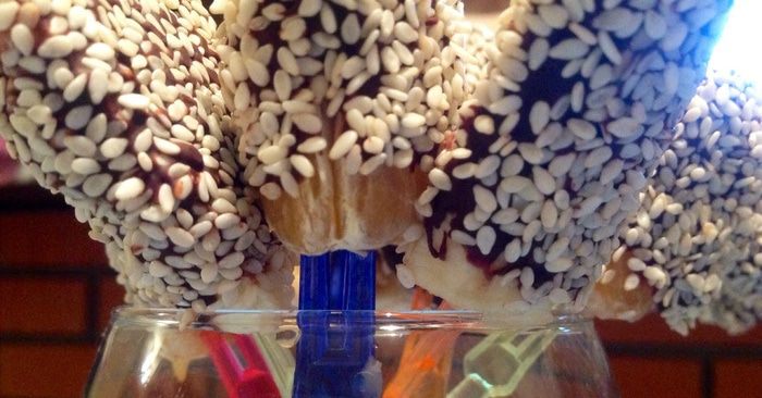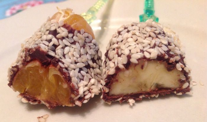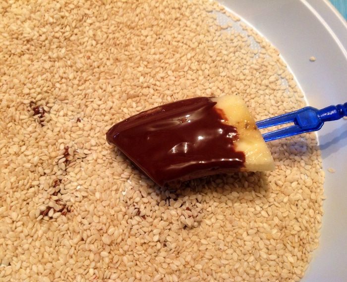 Порезали бананы сначала на брусочки, потом каждый брусочек вдоль в длину, мандарины у меня были не крупные, поэтому я делила по 2 дольки вместе, растопили шоколад на водяной бане, тогда консистенция шоколада будет однородная, высыпали кунжут на тарелку.