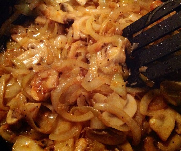 Потом к луку и грибам добавляем промытую, очищенную от пленок и просушенную бумажным полотенцем печень и тоже обжариваем, все это делаем на быстром огне чтобы выпарилась лишняя жидкость, постоянно помешивая, солим, перчим, добавляем паприку.