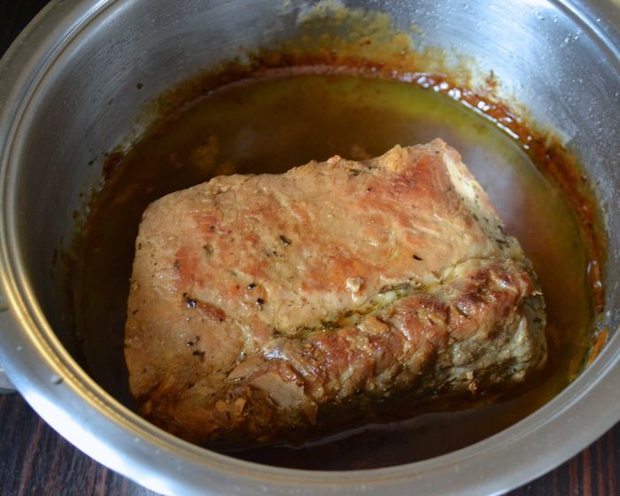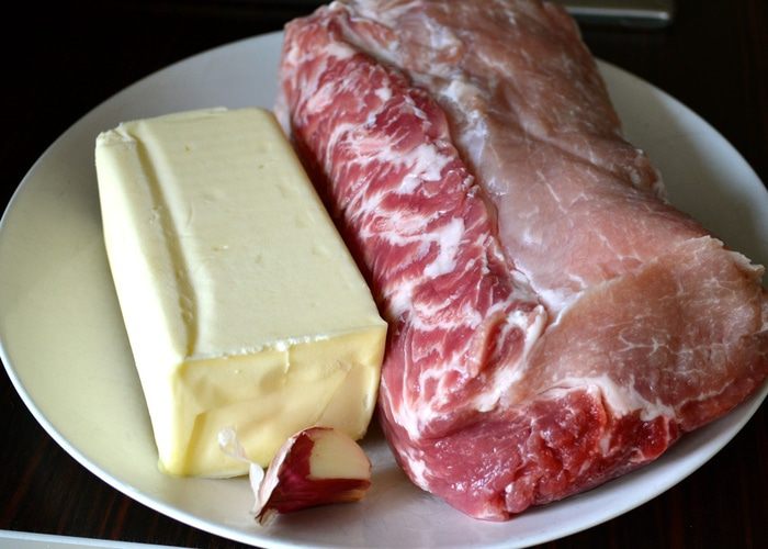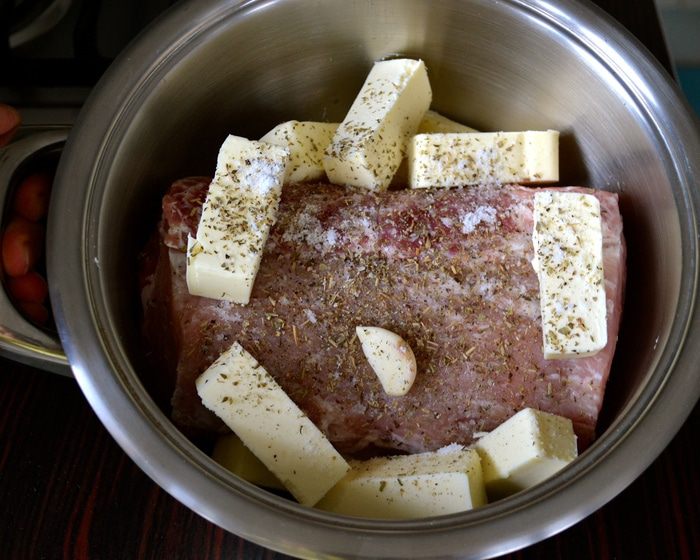 Свиную вырезку положить в небольшую кастрюлю с двойным дном. Кусок мяса должен занять, практически, весь объем кастрюли. Положить зубчики чеснока, нарезанное сливочное масло, посолить, поперчить по вкусу и посыпать смесью ароматных трав (на Ваш вкус).