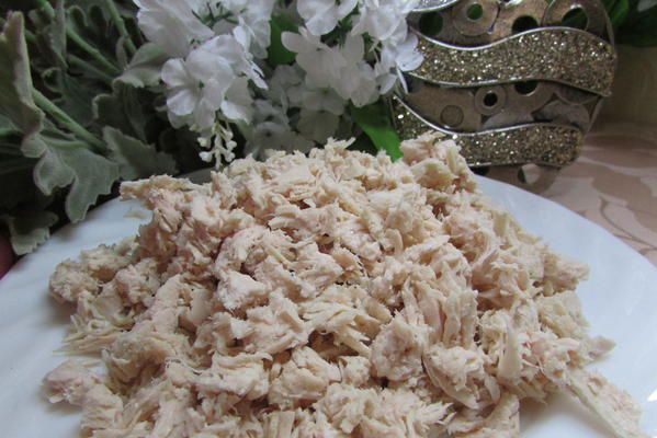 Курицу нарезать кусочками или разобрать на волокна.