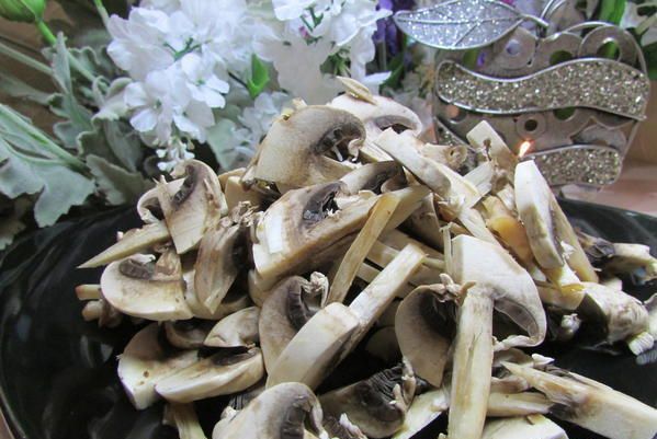 Шампиньоны обтереть салфеткой и нарезать тонкими пластинами.
