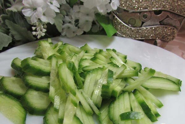 Огурец нарезать соломкой (я использовала тёрку для корейской моркови).