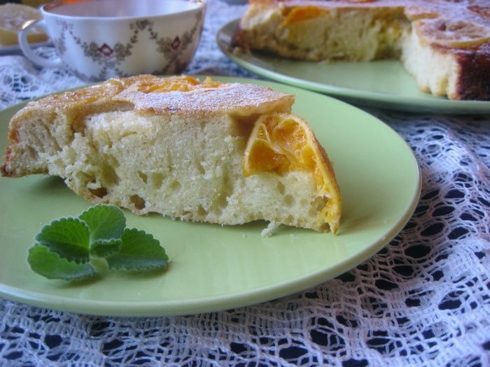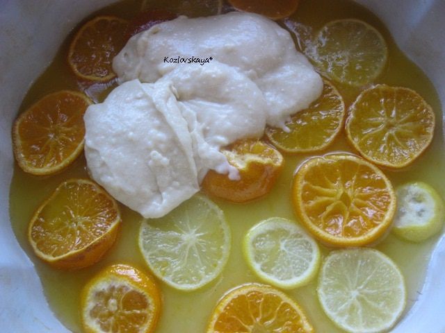 Готовое тесто аккуратно, равномерно переложить на цитрусы.