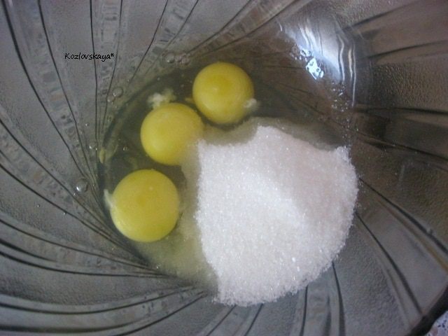 В большой миске взбить яйца с сахаром, до белой массы.