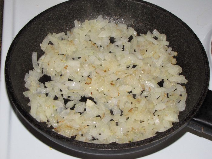 Очистить лук и мелко нарезать. В сковороде разогреть немного масла, положить лук, обжаривать до золотистого цвета, 7 минут.