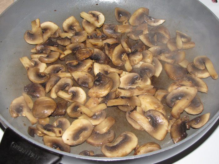 Шампиньоны разрезать пополам, а затем небольшими дольками. Обжарить в отдельной сковороде в небольшом количестве масла на сильном огне до румяной корочки.