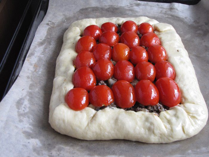 Помидоры черри разрезать пополам, выложить на открытый фарш срезом вниз. Смазать маслом тесто и помидоры.