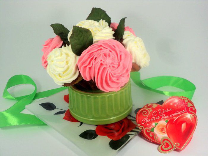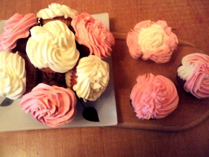 При помощи кондитерского шприца нанести крем на капкейки в виде лепестков роз. На шоколадные капкейки – розовый крем, на белые - белый крем.