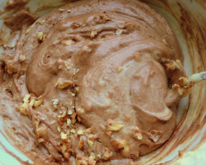 В оставшуюся часть теста добавить какао и дробленные грецкие орехи, перемешать.