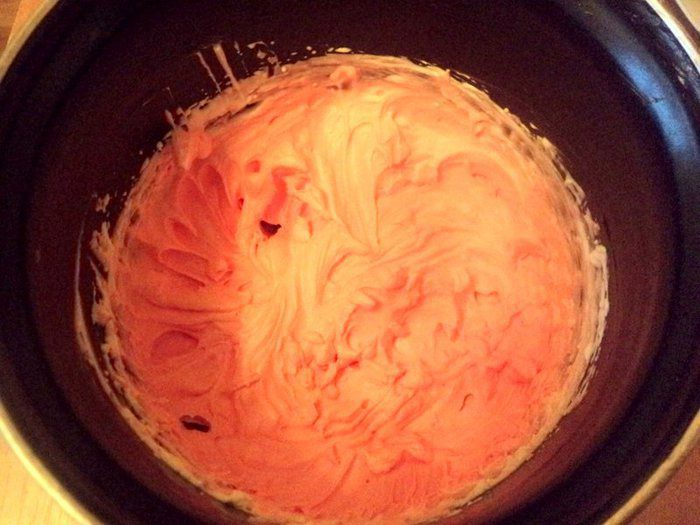 Взбитые сливки разделить на 2 части. В одну часть добавить красный пищевой краситель.