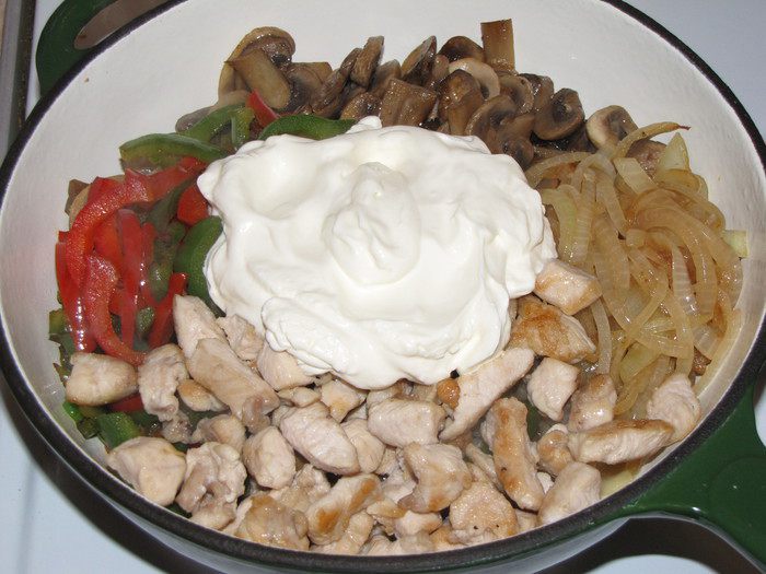 Соединить филе, грибы лук и перец, залить вином и сметаной.