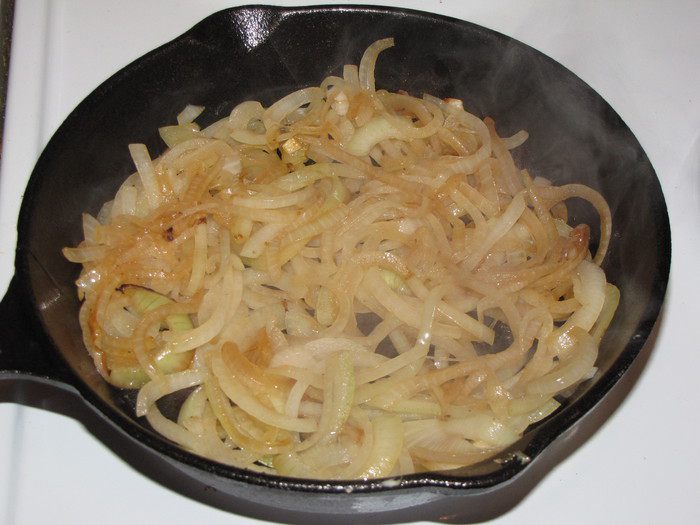 Лук нашинковать тонкими полукольцами и обжарить до мягкости.