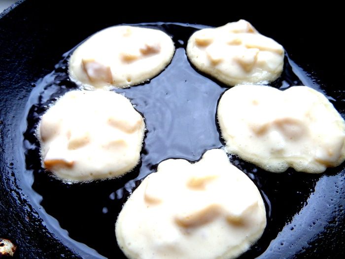 Выкладываем тесто с начинкой по ложке в разогретое масло.